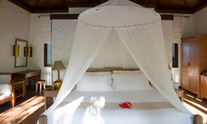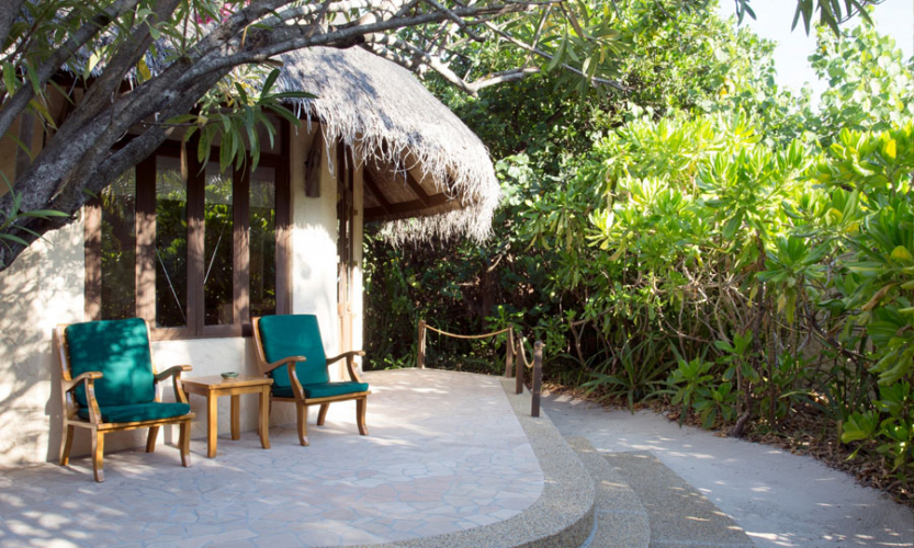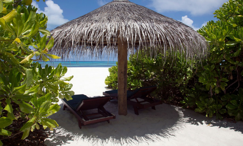 The sound of the thatch fringe and mature tropical plants and trees in the soft breeze perfectly captures the mood of island life. A walk along a short, canopied pathway lined with vibrant plants and trees leads to the largest stretch of beach on the island and the lagoon beyond.