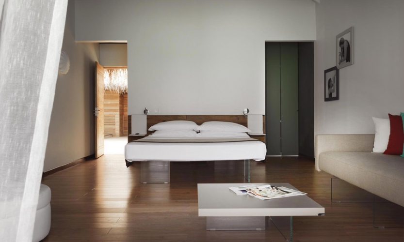 The mood for Cocoon Maldives is exclusive. Every element, from the complementary pieces and the fabrics for the curtains to the greenery, makes the perception of this space, sartorially designed, unique. From every point in the room guests are treated to views that maintain a constant visual relationship with the landscape. Materials and colours change in tune with the various sensations.