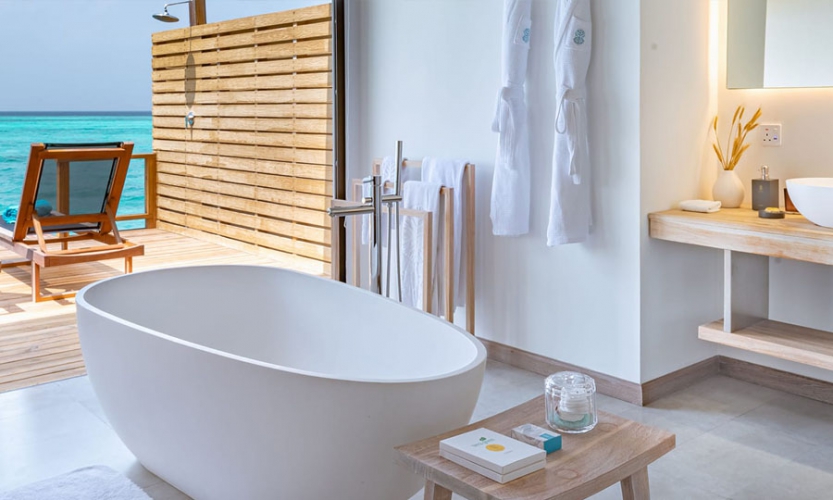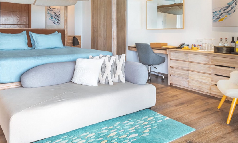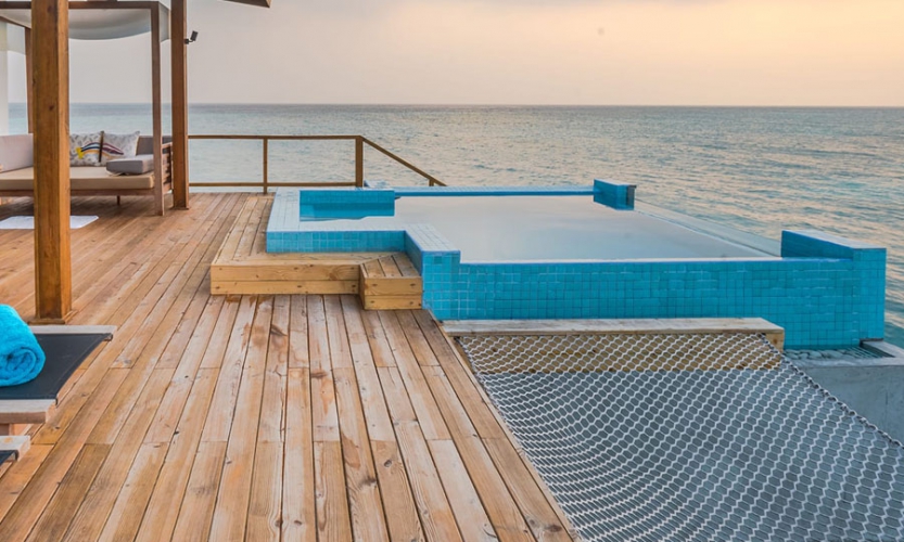 Enjoy uninterrupted views over the ocean as the sun sets in your private water villa with plunge pool. A glass front panel allows you to completely soak in the sapphire seascape from your private pool. Laze under the four-posted cabana on the lounger-strewn deck and jump off your deck into the azure lagoon to cool off.