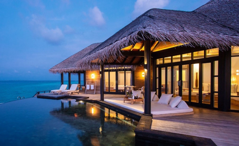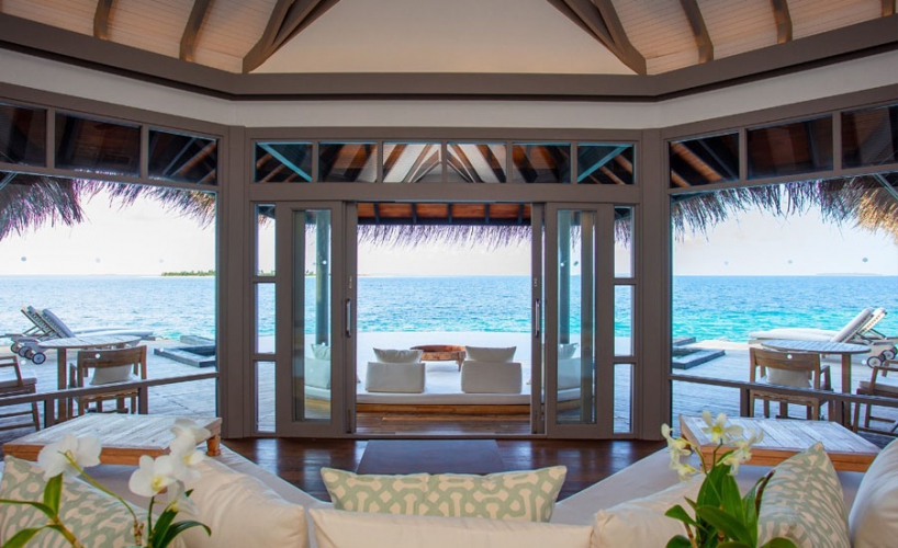 Perfectly perched right at the tip of the water villas. With a direct lagoon access, marvel at the expansive views of the Indian Ocean’s turquoise waters and two uninhabited islands. Floor-to-ceiling wooden doors within the lavish living area open to reveal an inviting infinity pool and an outdoor sundeck.