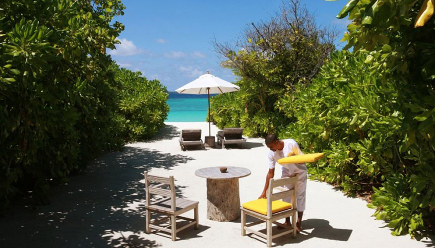 Hidden between the lush tropical vegetation facing the lagoon, these stylishly sustainable Maldives beach villas offer absolute privacy. The beach is only a few meters away and sun loungers are placed strategically for sunshine and shade between the sparkling waters of the lagoon and the hideaway retreat.