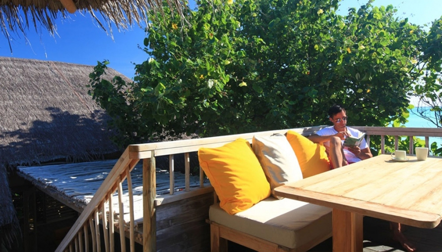 This two-bedroom pool villa in the Maldives is hidden between the lush tropical vegetation facing the ocean and is ideal for large families or friends traveling together. It comprises two beach villas, each with its own spacious bedroom and outdoor bathroom, in-between there is a shared dining and living area. This family hideaway features a 33 feet (10 meter) private pool and private access to the beach, which is only a few meters away. Sun loungers are placed strategically for sunshine and shade around the pool.